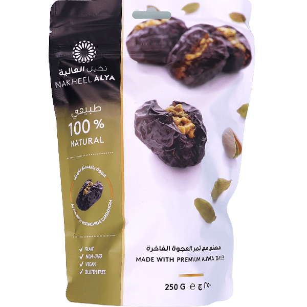 Ajwa Dates Pistachio & Cardamom Nakheel Alya 250g | تمر عجوة بالفستق والهال نخيل العالية 250غ