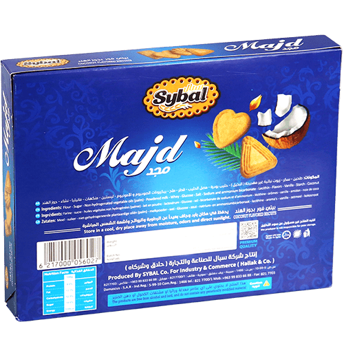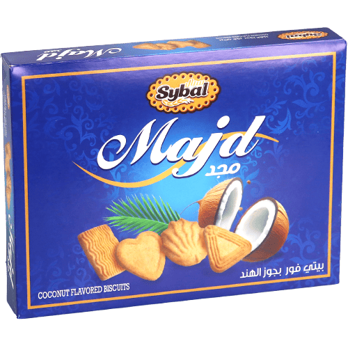 بسكويت لذيذ بنكهة جوز الهند من مجموعة سيبال مجد. أشكال متنوعة بطعم الزبدة الغني ونكهة جوز الهند الطبيعية. مثالي لوقت الشاي أو التسالي أو تقديمه للضيوف. يأتي في علبة هدايا جذابة.