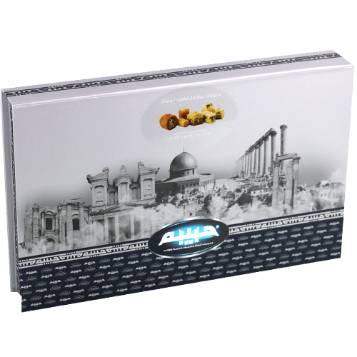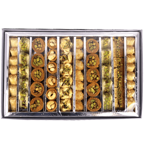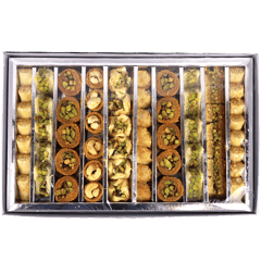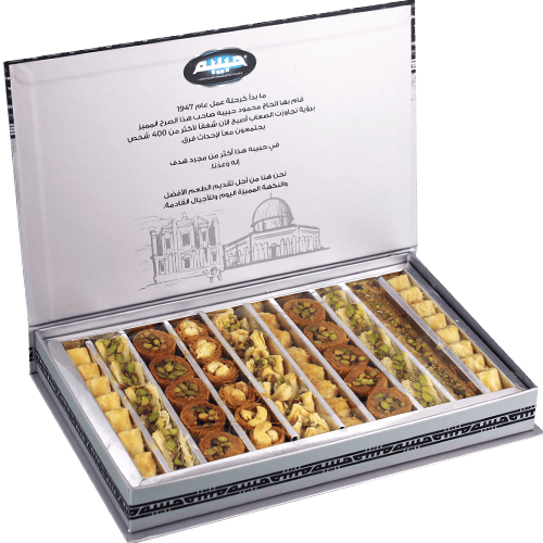 علبة فاخرة من بقلاوة حبيبه المشكلة تحتوي على تشكيلة من قطع البقلاوة الشرقية المحضرة من رقائق عجين الفيلو الهشة والمكسرات الفاخرة مع شراب سكر خفيف. تضم العلبة عادة أعشاش وفصوص رول وقطع بقلاوة محشوة بالفستق والكاجو وغيرها من المكسرات، ومصنوعة من دقيق القمح والفستق والكاجو والزبدة أو السمن وشراب السكر لتمنح طعمًا شرقياً أصيلاً.