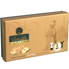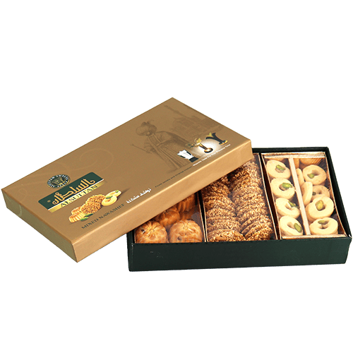 س: شو الأنواع الموجودة عادة داخل العلبة؟ ج: غالباً معمول تمر + برازق سمسم + غريبة (وقد تكون بعض القطع مزينة بالفستق).