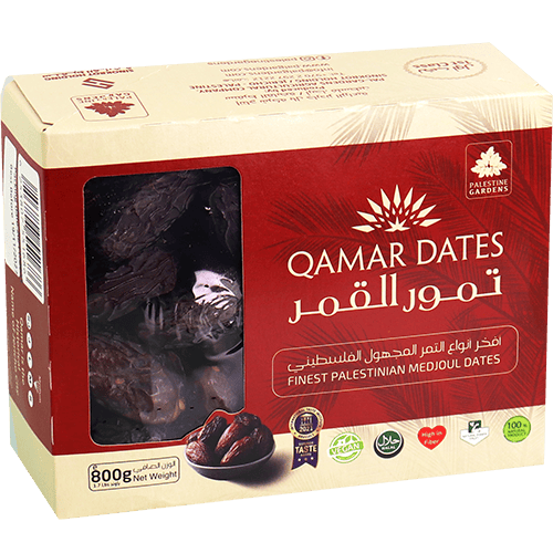 تمر مجدول فلسطيني فاخر من تمور القمر بعبوة 800غ، مناسب للتقديم مع القهوة والضيافة وكوجبة خفيفة يومية.