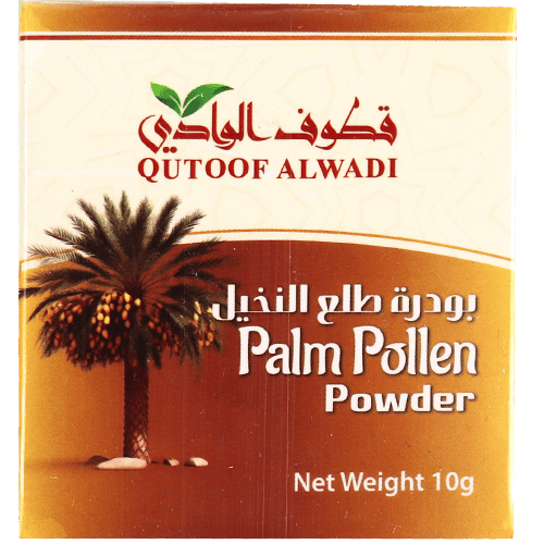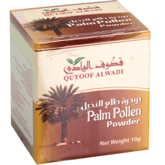 بودرة طلع نخيل ناعمة بعبوة 10 غرام، تُستخدم تقليدياً كمكمل طبيعي لدعم الحيوية وتحسين الخصوبة وتعزيز الصحة العامة.