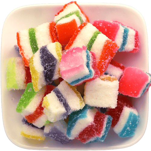 مكعبات جيلي ملونة بطبقات جميلة ومغطاة بالسكر، مناسبة للضيافة والقرمشة الخفيفة مع الشاي أو القهوة. أفضل 5 استخدامات: للضيافة على صحن الحلويات، لتعبئة أكياس هدايا الحفلات، لبوفيه الحلويات والكاندي بار، للتزيين فوق الكب كيك/الدونات (كقطعة تزيين)، كسناك حلو أثناء السفر أو بالسيارة. أسئلة شائعة: كيف أحفظها؟ احفظها بمكان بارد وجاف وبعلبة محكمة. هل تناسب المناسبات؟ نعم ممتازة للضيافة وتقديمها مع حلويات أخرى. هل يمكن وضعها على الحلويات؟ نعم كقطع تزيين أو داخل علب الحلويات المشكلة. هل هي قاسية أم طرية؟ عادة تكون طرية من الداخل مع طبقة سكر خفيفة من الخارج. ما حجمها؟ مكعبات صغيرة مناسبة للأكل لقمة.