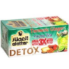 خلطة ديتوكس من العطار ضمن 24 ظرف، تجمع بين الشاي الأخضر والكركم والزنجبيل بطعم عطري وقوي، وتُشرب كمشروب دافئ.