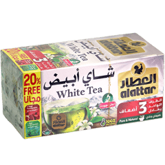 شاي أبيض من العطار بأكياس شاي، طعمه خفيف وناعم ومناسب للشرب يومياً ساخن أو بارد.