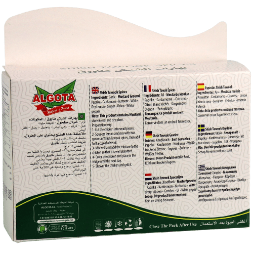 Algota Shish Tawook Spices is a Middle Eastern seasoning mix made to marinate chicken cubes for shish tawook skewers, giving a warm, garlicky and slightly smoky flavor ideal for grilling or pan‑frying.