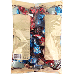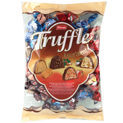 Elvan Truffle Assortment is a mixed bag of individually wrapped truffle-style chocolates with assorted cream fillings (hazelnut, caramel, strawberry, coconut) and crisped rice pieces.