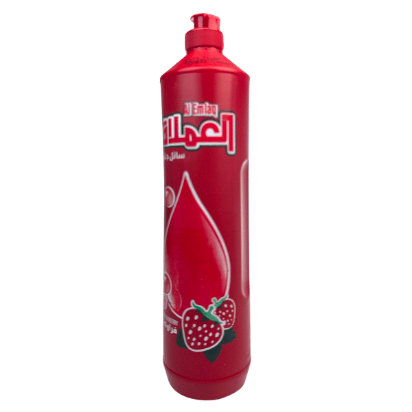 Emalaq brand dishwashing liquid with strawberry fragrance, effective for cleaning and degreasing dishes. Main ingredients: anionic surfactants, non-ionic surfactants, strawberry fragrance, water, colorants.