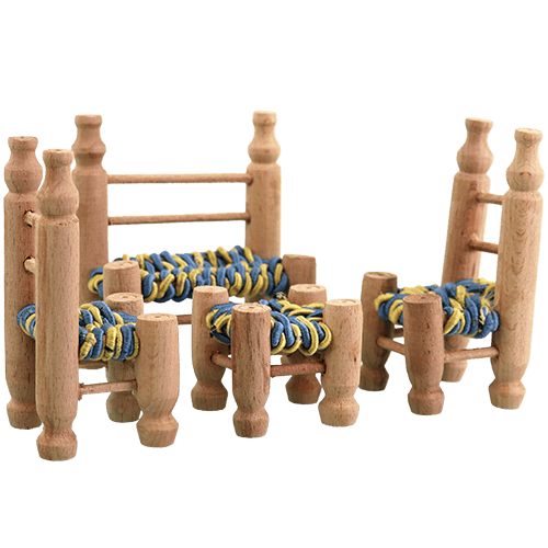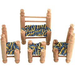 Handmade mini traditional seating set (4 pieces), suitable for dollhouse scenes, dioramas, decorative shelves, and photo styling. It features a small bench with three small stools and woven-style seats for a traditional look.
