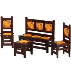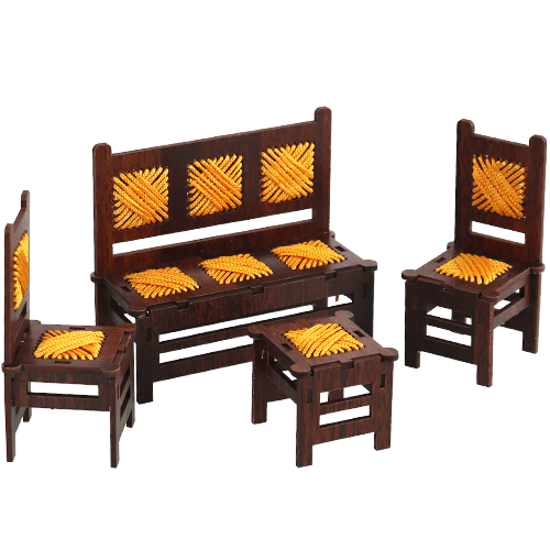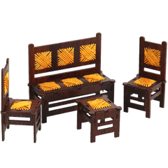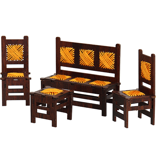 Decorative miniature wooden living-room set (sofa, 2 chairs and 1 small table), made for display only. Dark wood look with yellow woven-style seat details; nice for shelf, desk décor, or a small gift.