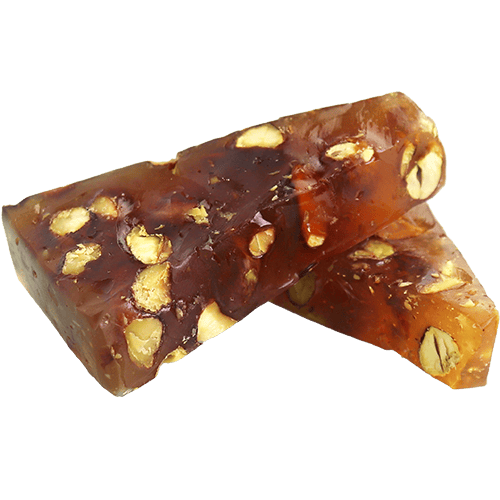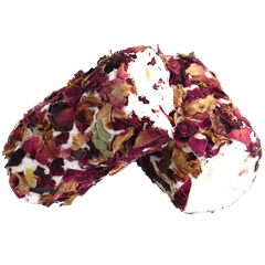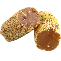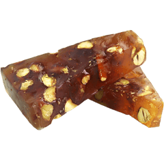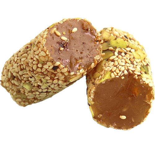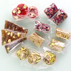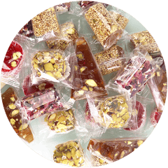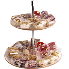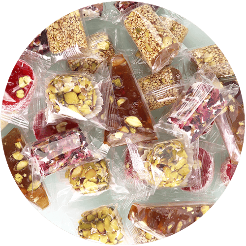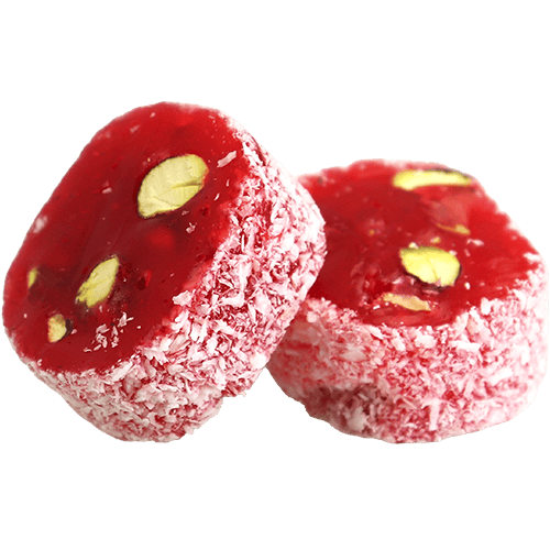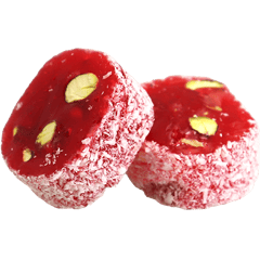 An assorted selection of classic Turkish delight cubes made from a soft starch and sugar gel, dusted with powdered sugar, with mixed flavors such as rose, lemon, pomegranate, mint and fruit, and sometimes enriched with nuts like pistachios, hazelnuts or walnuts for extra crunch and aroma.