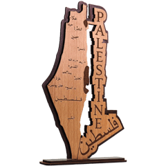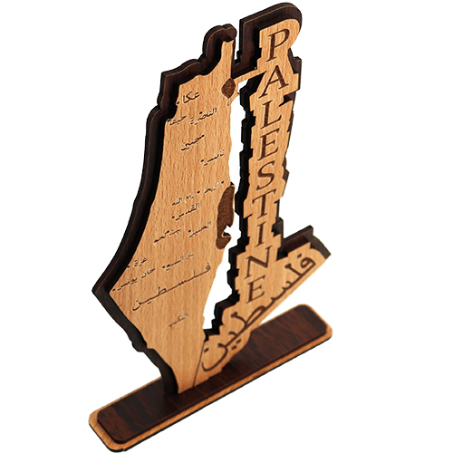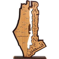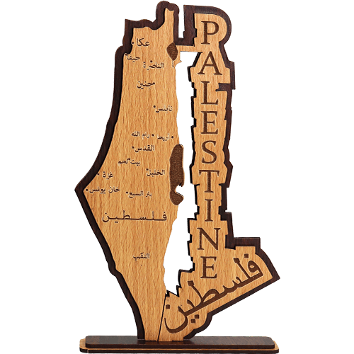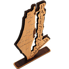 Wooden Palestine map desk decoration with a stable base, ideal for office desks, shelves, and as a meaningful gift.