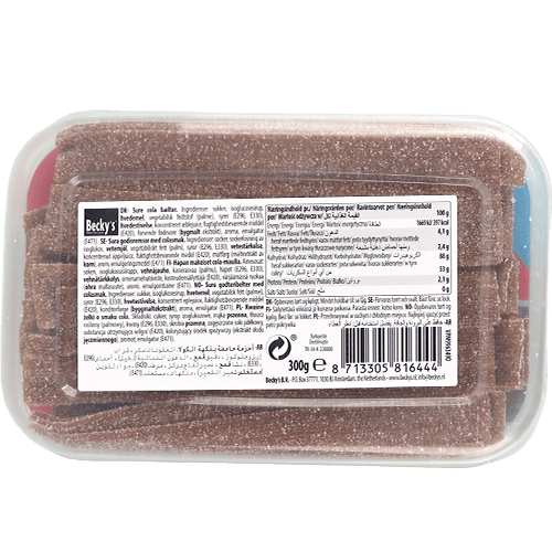 Delicious vegan sour cola flavored gummy candy strips from Becky's. Halal certified with natural colors and tangy sour coating. Fun and chewy texture, perfect for candy lovers who enjoy sour sweets. Main ingredients: glucose syrup, sugar, gelatin alternative, acid (citric acid), natural flavors and colors.