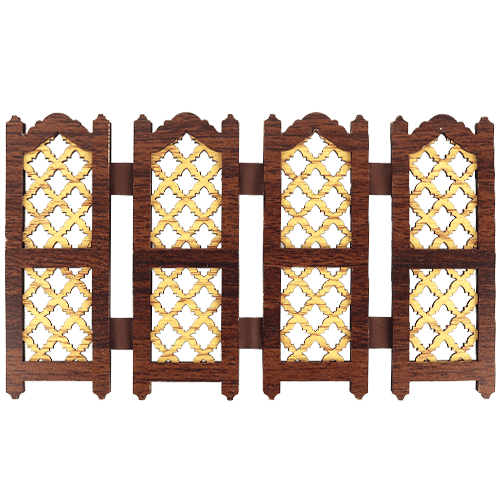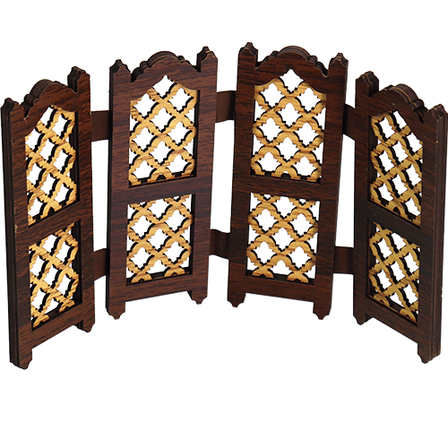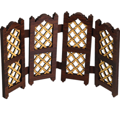 Decorative wooden mashrabiya-style panel figurine, inspired by traditional Arabic lattice screens, ideal as a small room divider effect or tabletop décor piece.