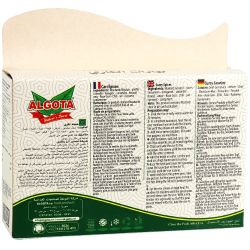 Algota kerrie specerijen is een aromatische kerriemix die vlees, kip, groenten en stoofschotels een warme smaak en mooie goudgele kleur geeft.