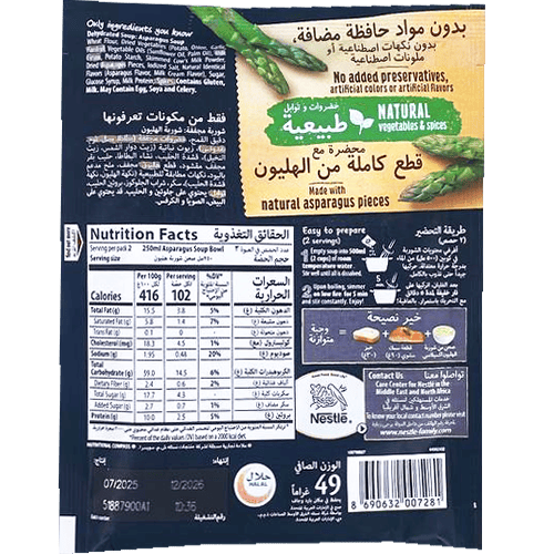 Romige instant aspergesoep van Maggi Excellence met natuurlijke stukken asperge, groenten en kruiden, in enkele minuten klaar door alleen water toe te voegen en kort te laten koken.
