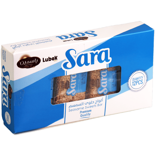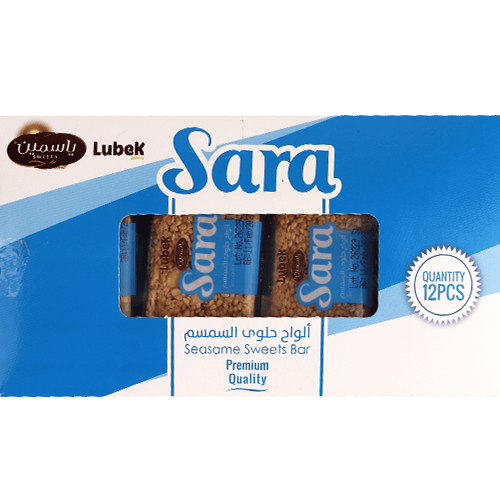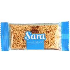 Knapperige zoete sesamreep van het merk Sara Lubek. Ingrediënten: sesam, pinda's, suiker, glucose, citroenzuur. Bevat allergenen: sesam, pinda's.