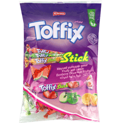 Zachte, kauwbare snoepsticks met gemengde fruitsmaken (appel, sinaasappel, aardbei, watermeloen), individueel verpakt en ideaal om te delen bij bezoek of feestjes.