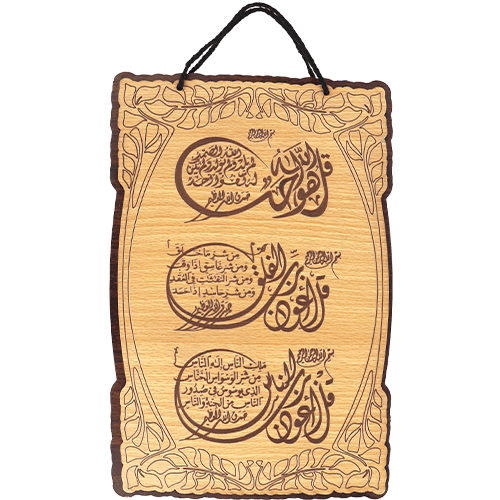تعليقة ديكور خشبية بنقش خط عربي إسلامي (المعوذات) مع حبل للتعليق، مقاس تقريبي 29×19 سم، مناسبة للبيت والمكتب وزاوية الصلاة وتعطي لمسة روحانية جميلة.