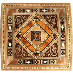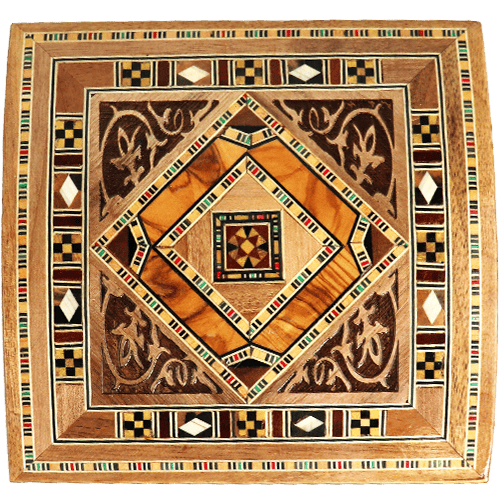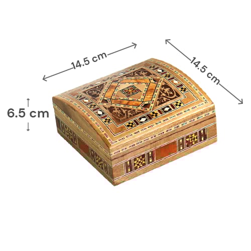 صندوق خشبي مزخرف بنقوش موزاييك شرقية مع غطاء مفصلي وبطانة داخلية ناعمة، مناسب لحفظ المجوهرات والإكسسوارات والهدايا الصغيرة؛ المقاس 14.5×14.5×6.5 سم.